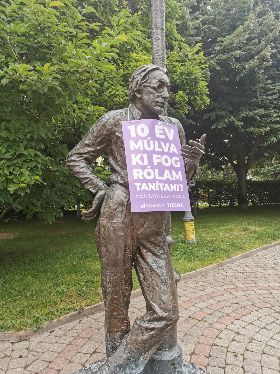A táblákon a „10 év múlva ki fog rólam tanítani?” szöveg áll, utalva arra, hogy az oktatás súlyos válsága miatt lassan alig marad tanár a magyar iskolákban.