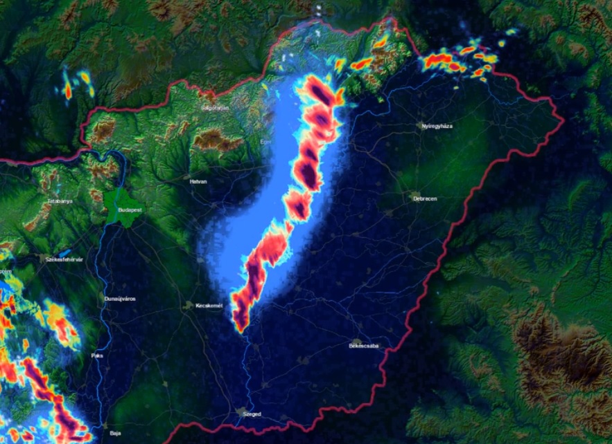 Az Időkép radarján egy markáns zivatarlánc látható, amely este nyolc körül érte el a Tisza vonalát, és lassan halad kelet felé (felső kép). A meteorológiai szolgálat az ország nagy részére – Hajdú-Bihar megyére is – másodfokú (narancssárga) riasztást adott ki a zivatarveszély miatt.