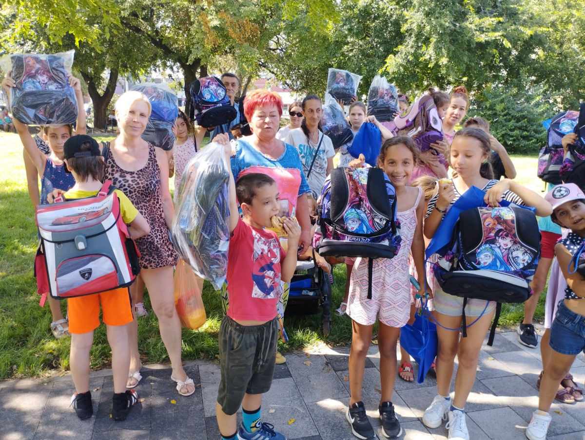 Jövő héten kezdődik a tanév. Az ételosztást ezért tanszerosztással is egybekötöttük. Előzetesen egyeztettünk a szülőkkel, így előre elkészített iskolatáskák, tanszercsomagok várták őket. Minden családnak jutott liszt is, a gyerkőcök édességet is kaptak.
