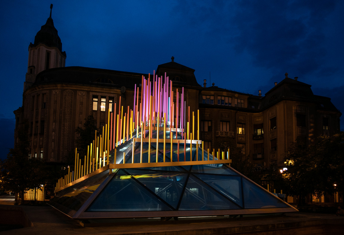Országosan egyedülálló és új művészeti alkotás készült Debrecen főterén, az Üvegpiramisban – tájékoztatott az önkormányzat. A piramisban látható új adatalapú installáció a város történetét meghatározó tűzvészek krónikáját formálja különleges emlékművé.