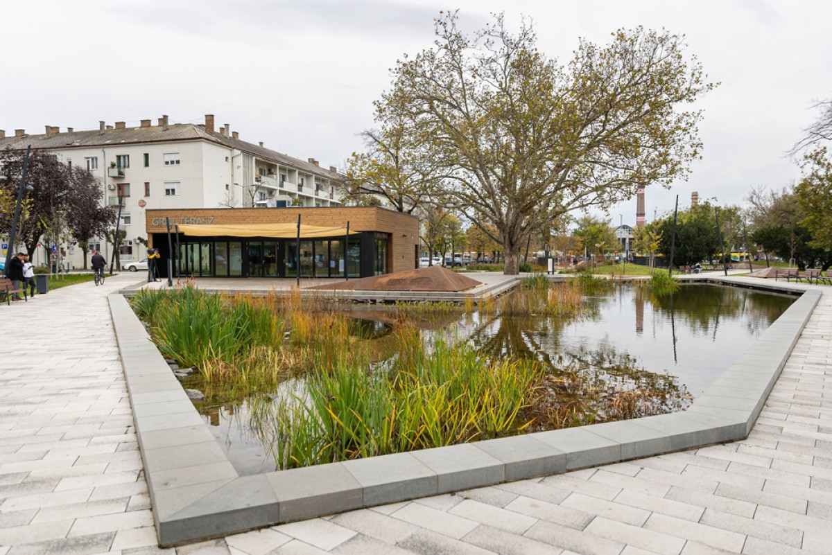 A vendéglátó pavilont a tó partján alakították ki. A 179 négyzetméteres épületnek van benti és teraszos fogyasztótere. A pavilon épületében helyet kapott egy olyan közforgalmú, akadálymentes, automata illemhely is, amit a téren tartózkodó emberek is használhatnak majd, hiszen kívül van az ajtaja.