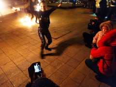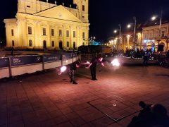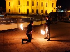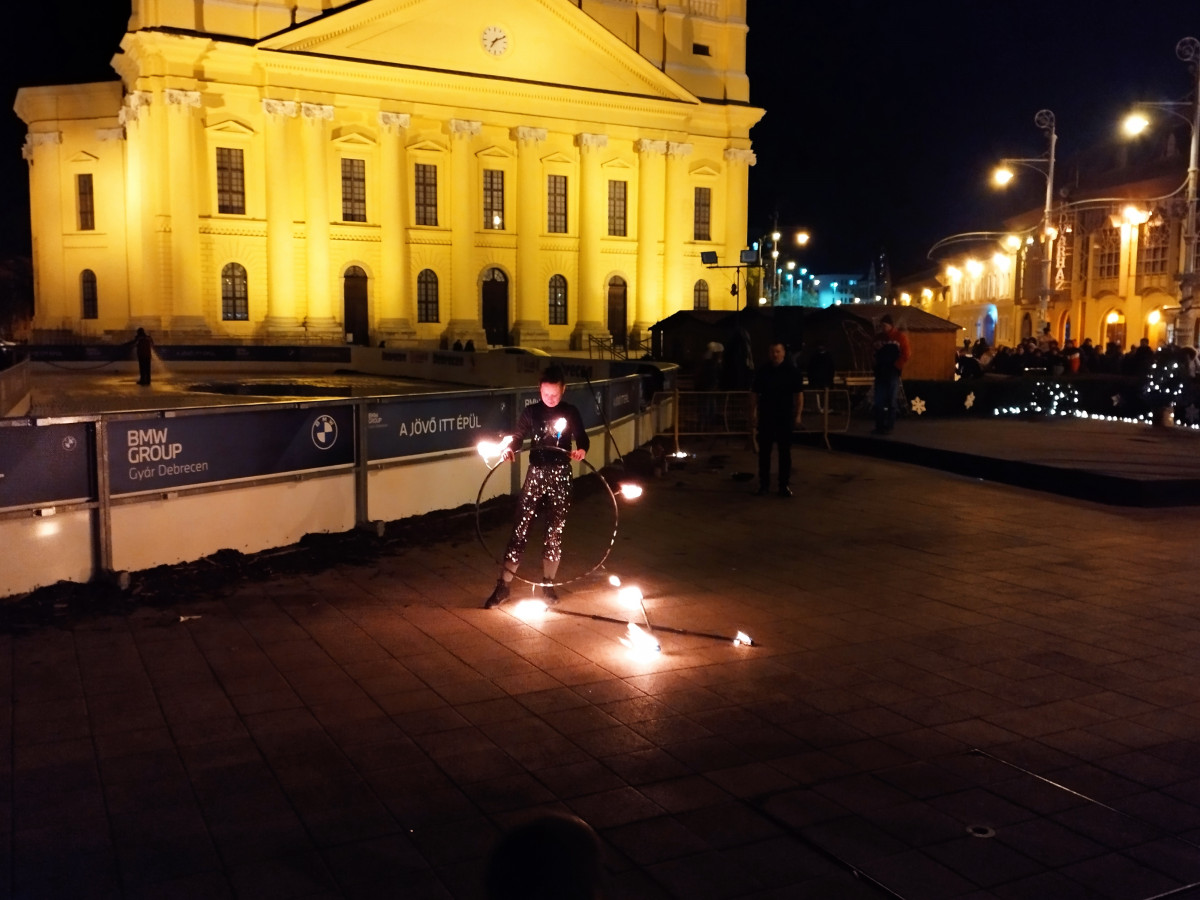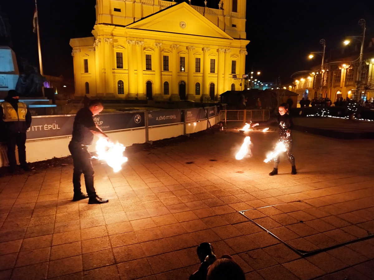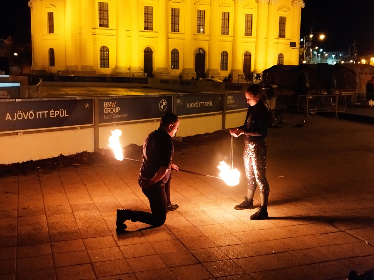 A nyitónap legnagyobb attrakciója a zenés és táncos produkciókon túl egyértelműen az este hét órától a műjégpálya előtt fellépő Főnix tűzzsonglőr csoport húsz perces előadása volt. A tűzszelídítők produkciója ámulatba ejtő volt, és valóban érdemes volt megvárni a csípős hidegben. A tűz formái lebilincselő látványt nyújtottak, a két művész igazán jól játszott a tűzzel, és ehhez segítségül hívtak egy lángoló karikát is, amit a testükön is megpörgettek. Ezek után nem volt meglepő, hogy vastapsot kaptak a közel ötven érdeklődőtől. Vasárnap utcaszínház és harmónikajáték szórakoztatja a kilátogatókat.