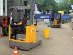 A harmadik érdekesség nekem az a targoncaverseny volt, ahol elektromos targoncákkal különböző ügyességi feladatokat kellett végrehajtani a szerencsés versenyzőknek. Ilyen volt a villával egyensúlyozni egy gumilabdát, amit egy gyűjtőedényig kellett elvinni, de raklapokkal és gumiabroncsokkal is meg kellett birkóznia a delikvenseknek.