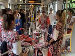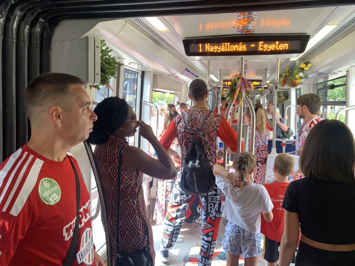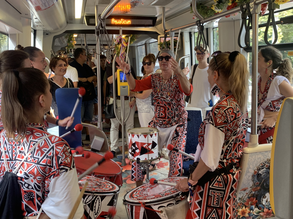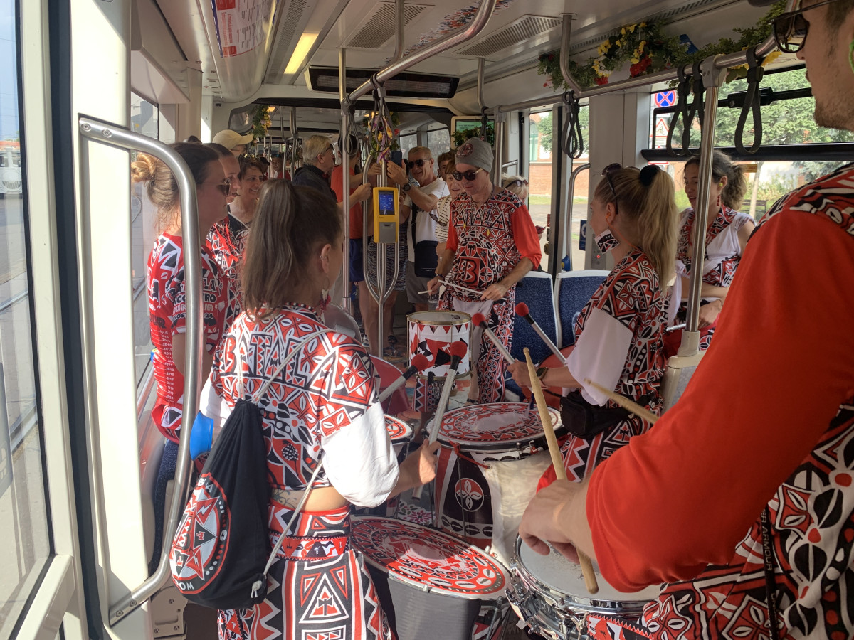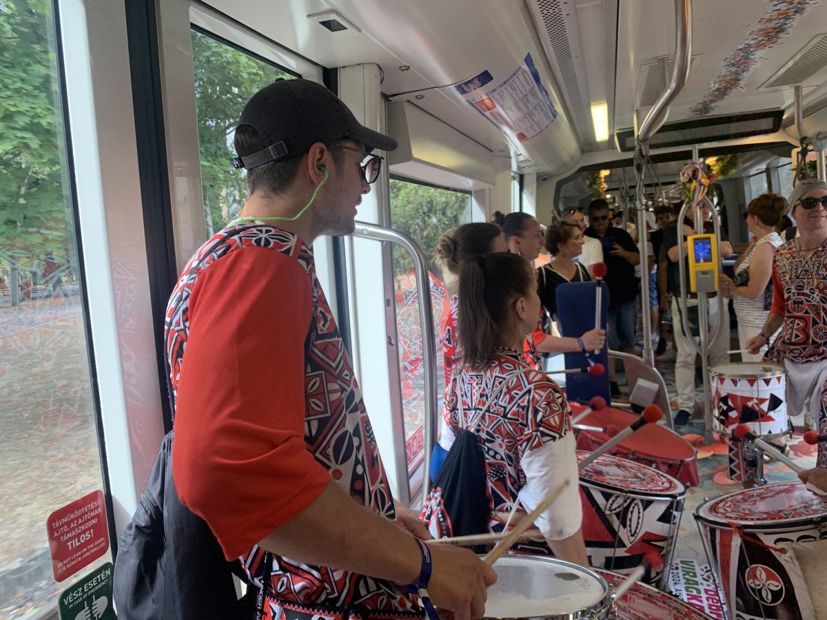 Zenés villamos szállította az utasokat Debrecenben szombat délután, a jó hangulatot a virágkarneválon is látható, Brazíliából érkezett Batala Internacional szolgáltatta.
