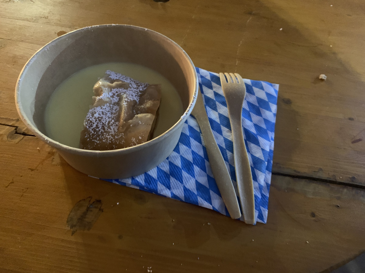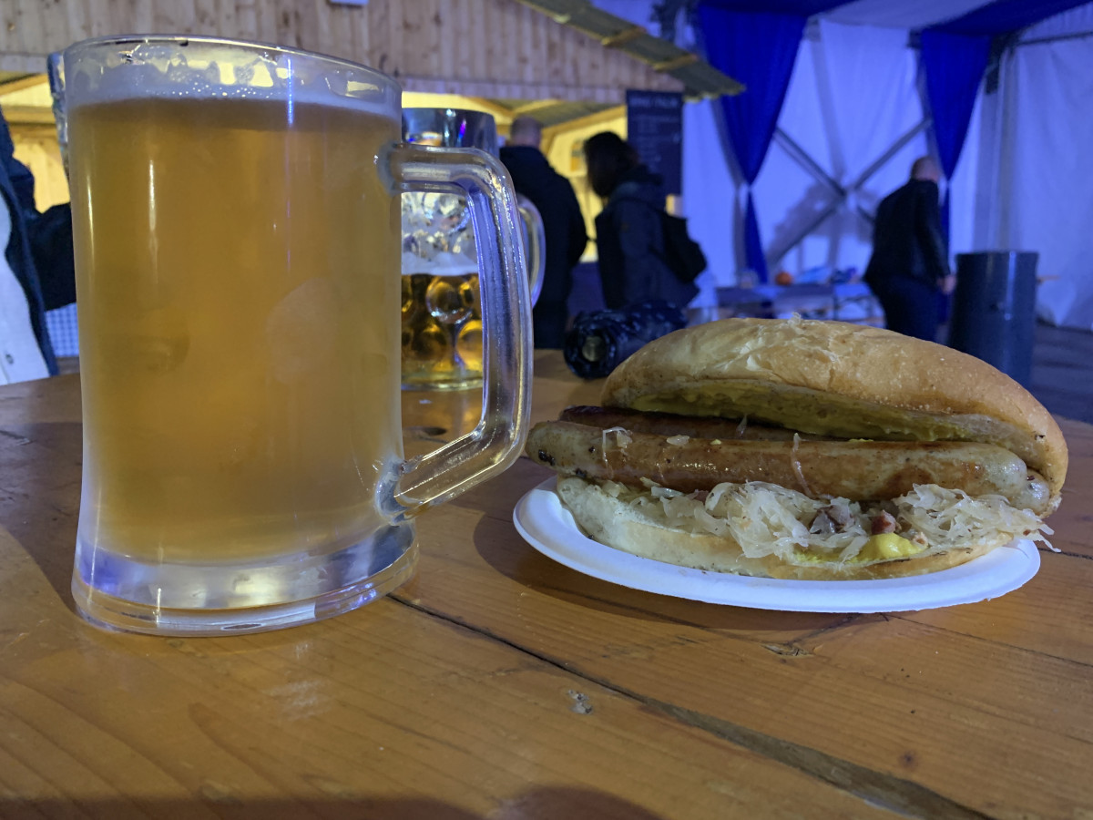 A habos frissítő komlószármazékok mellé sörkorcsolya gyanánt bajor perecet és egy Nürnberg bratwurstot választottam, amelyet egyébként egyfajta hot-dognak is lehetne értelmezni, de ezzel szemben itt az oltalom alatt álló bajor grillkolbász az édes mustár és a baconos savanyú káposzta almával jelenti a különbséget, ami 3000 forintért egész laktató és jó választás volt. Nem úgy a már említett sajtos perec, amelyet viszont ugyanúgy egy csapolt sör áráért kínáltak. Jóllaknom nem sikerült vele, így végül egy másik standnál desszert gyanánt almás rétest kértem vaníliasodóval. 1900 forintért árulták, de az íze miatt már önmagában megérte és nem is kellett sokat várni rá.