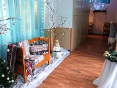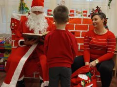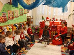 Száncsengő csilingelése jelezte a piros ruhás jótevő érkezését, akit minden csoportban a feldíszített kandalló elé ültettek, hogy a hosszú út fáradalmait kipihenje, megmelegedjen. Mindenkihez személyesen szólt és a gyermekek ámulva hallgatták, hogy minden csínytevésükről tud, mindent látott a varázstávcsövén keresztül. Miután minden gyermek megkapta a csomagját megígérték, hogy jövőre is szófogadó gyermekek lesznek.