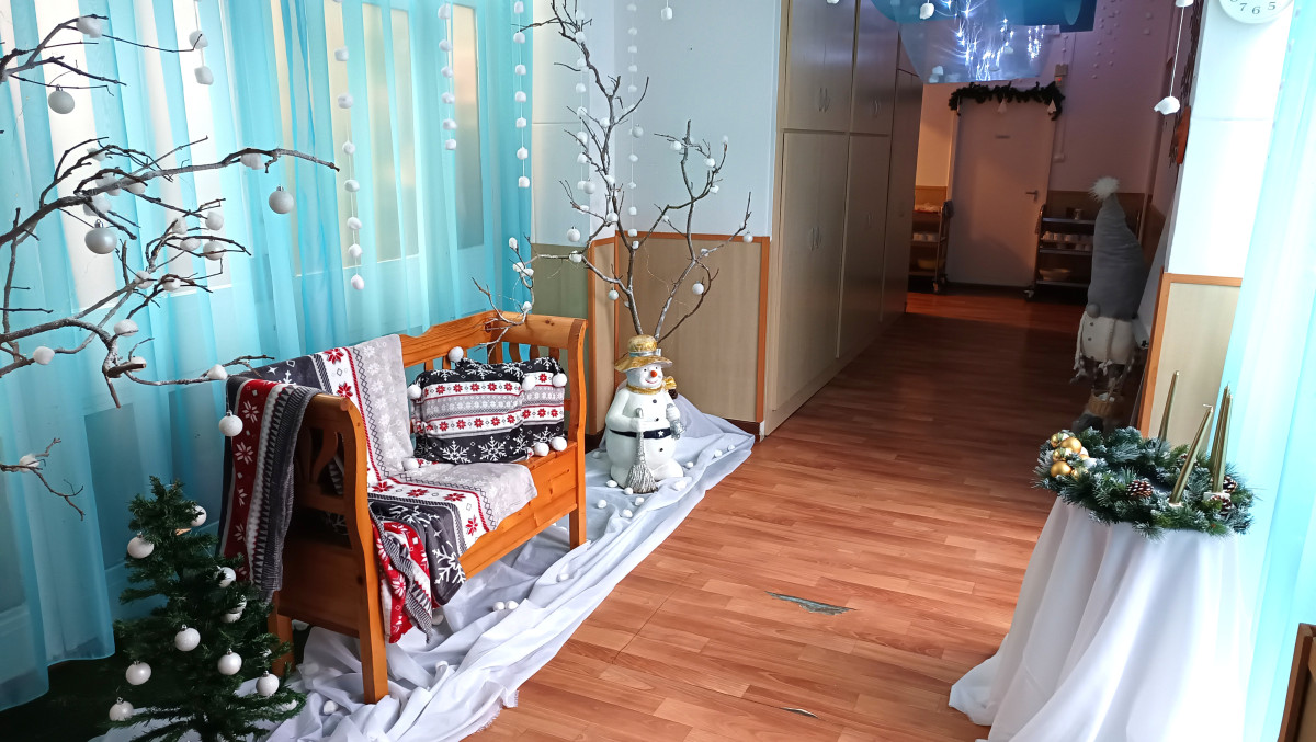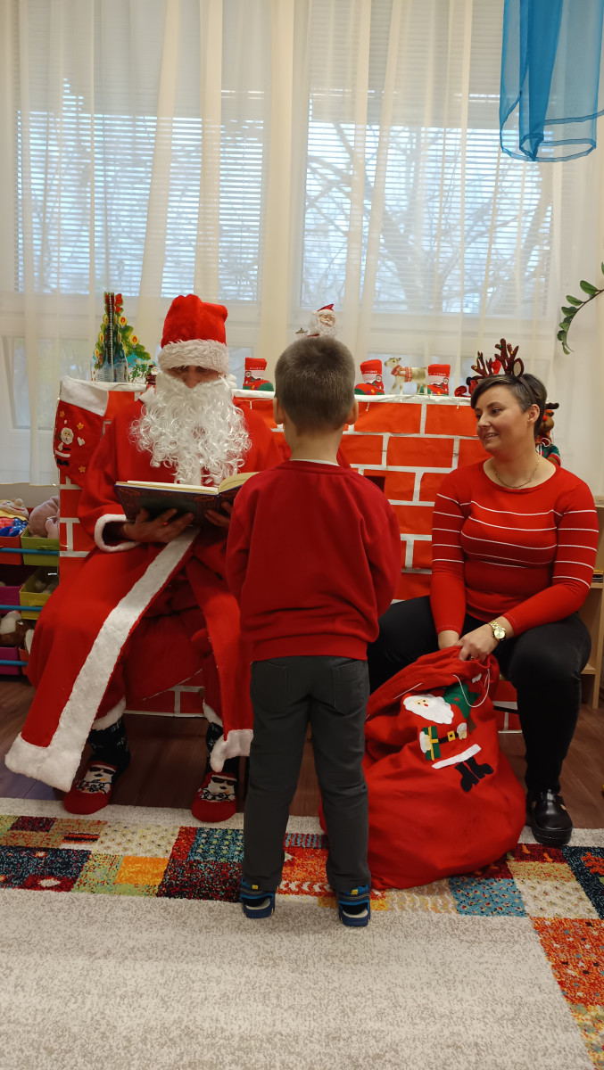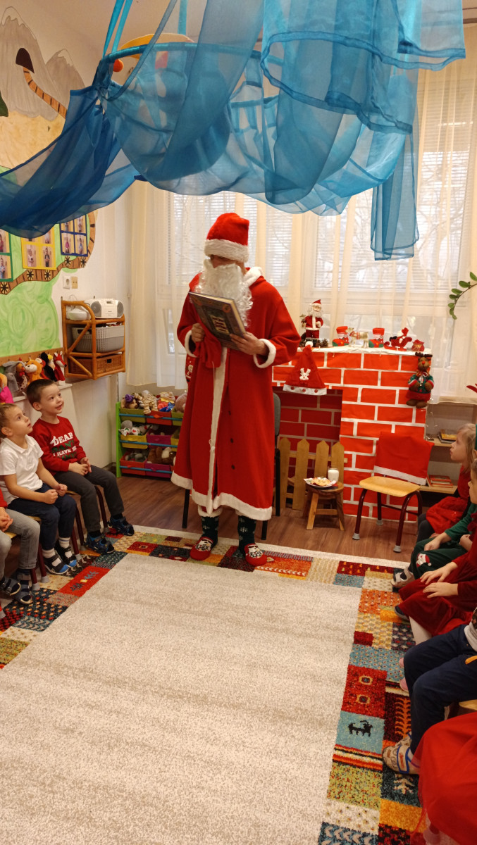 Száncsengő csilingelése jelezte a piros ruhás jótevő érkezését, akit minden csoportban a feldíszített kandalló elé ültettek, hogy a hosszú út fáradalmait kipihenje, megmelegedjen. Mindenkihez személyesen szólt és a gyermekek ámulva hallgatták, hogy minden csínytevésükről tud, mindent látott a varázstávcsövén keresztül. Miután minden gyermek megkapta a csomagját megígérték, hogy jövőre is szófogadó gyermekek lesznek.