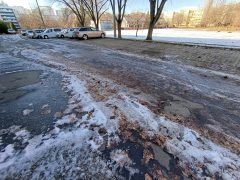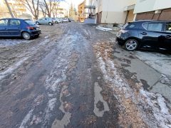 Így a szél szétfújta a kupacokat, majd a “termék” ráfagyott a házak mögötti útra, balesetveszélyessé téve azt. Helyszín: Debrecen, Martonfalvi utca.