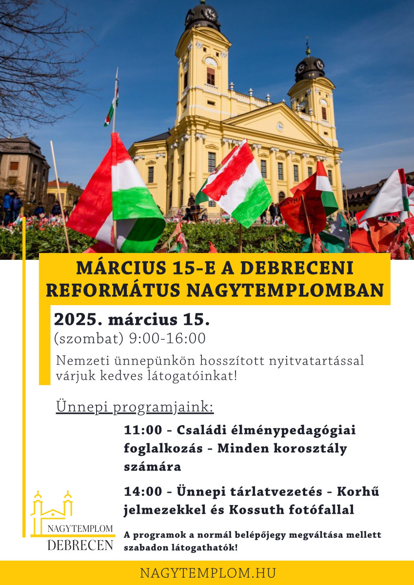 Nemzeti ünnepünk alkalmából, 2025. március 15-én, hosszított nyitvatartással (9:00–16:00) és izgalmas programokkal várja látogatóit a Debreceni Református Nagytemplom.