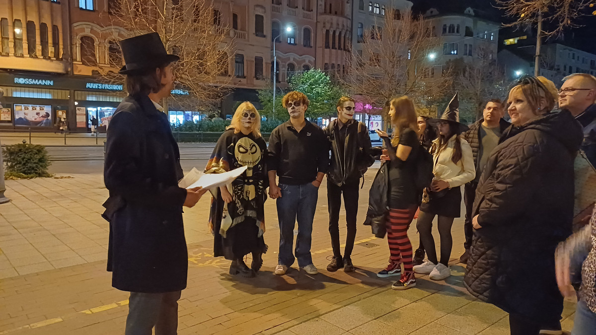 amelyet a fenti okok miatt nem adok itt közre, csak annyit szpojerezek, hogy egy ízig-vérig hajdúsági szörnyecskéről van szó. A történetmesélést ezen a helyszínen újabb performance színesítette: kártyatrükk jósló ingával kombinálva, másrészt a felvezetőben említett sikoltozás, amely a régi sárga „Bengáli” villamosból hallatszott, amelyet erre az estére a DKV Zrt. sínre tett „Rémségek villamosa” néven.