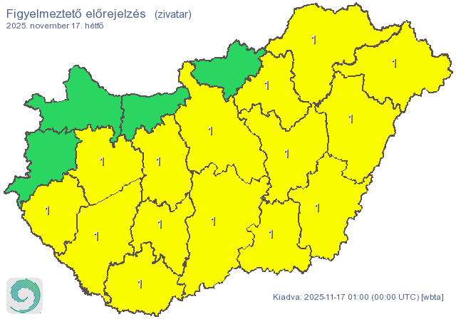 A meteorológiai szolgálat 15 megyére adott ki elsőfokú (citromsárga) figyelmeztetést a zivatarveszély miatt: