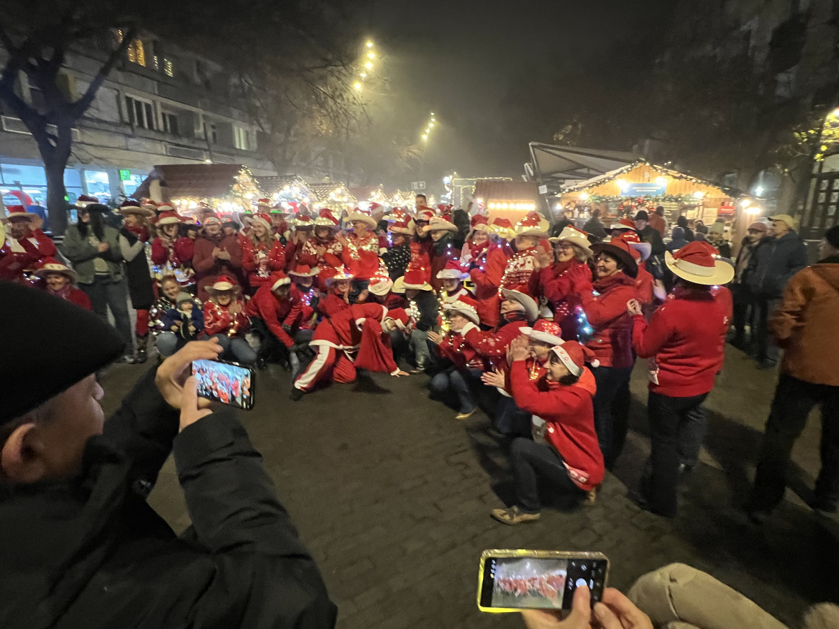 A résztvevők karácsonyi pulcsiban és színes égőkkel feldíszítve lejtették a táncukat az alkalomhoz illő klasszikus karácsonyi dalokra.