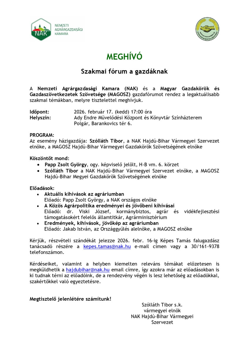 “Szakmai gazdafórumot” rendez a Nemzeti Agrárgazdasági Kamara (NAK) és a Magyar Gazdakörök és Gazdaszövetkezetek Szövetsége (MAGOSZ) 2026. február 17-én, kedden 17 órától Polgáron, az Ady Endre Művelődési Központ és Könyvtár színháztermében – adta hírül a szervezet.