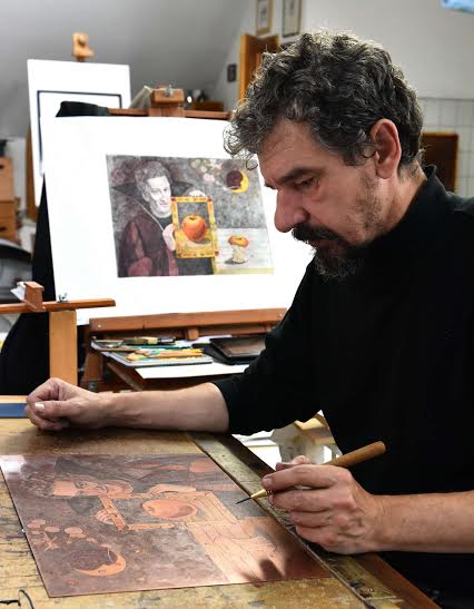 A kiállító művész kisiskolás kora óra rajzol, a szakma fortélyait önképzés révén sajátította el. Sokféle anyagot és technikát kipróbált, de a rézkarc technikájának varázslatossága és finomsága különösen megragadta.