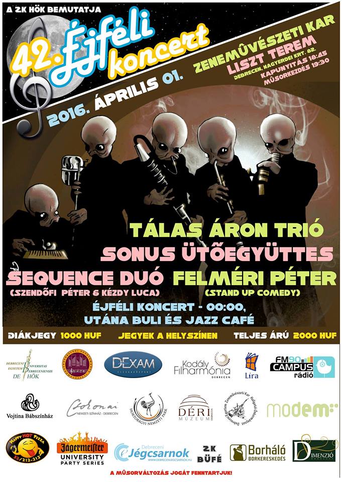 Április elsején éjféli koncert lesz a Debreceni Egyetem Zeneművészeti Karán – adta hírül az intézmény facebookos oldala.Fellépők: