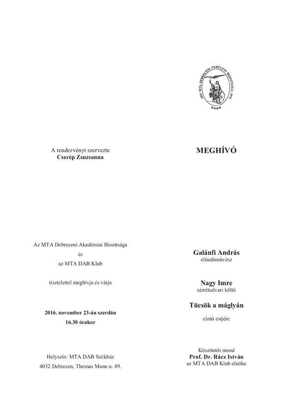 Tücsök a máglyán – Galánfi András estje a DAB székházban Kultúra november 16, 2016Szabolcs SzilágyiSzóljon hozzá a Tücsök a máglyán – Galánfi András estje a DAB székházban bejegyzéshez Közreműködik: Nagy Imre, sárrétudvari költő. Nézd meg Debrecen legjobb ár/érték arányú ingatlanjait Kiadó és eladó lakások egy helyen – Írisz Ingatlan Megnézem az ajánlatokat → Tetszett? Oszd meg másokkal is!