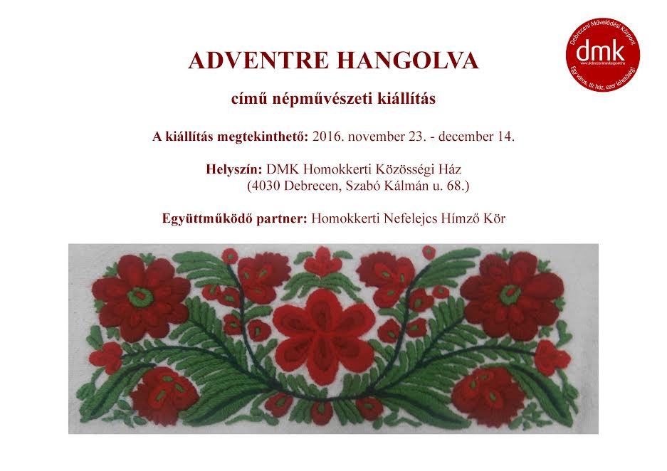 Adventre hangolva címmel népművészeti kiállítás nyílik november 23-án, szerdán, 14 órakor a Debreceni Művelődési Központ Homokkerti Közösségi Házában (Szabó K. u. 68.). Együttműködő partner a Homokkerti Nefelejcs Hímző Kör.