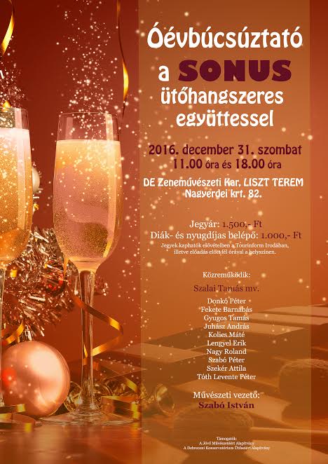 A SONUS ütőhangszeres együttes hagyományos óévbúcsúztató hangversenyét 2016. december 31-én tartja a Debreceni Egyetem Zeneművészeti Kar Liszt termében.