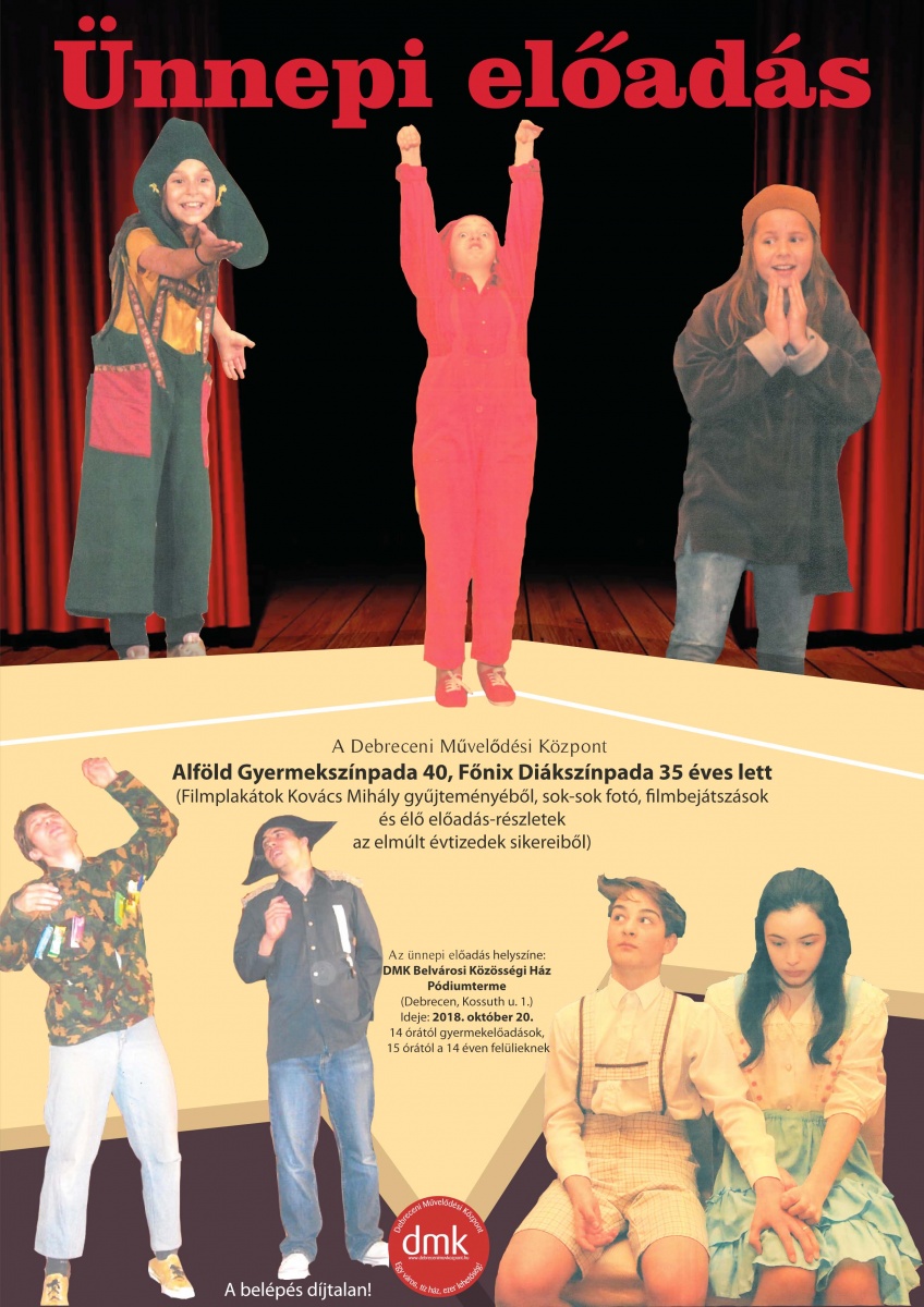 Szeretettel várnak minden kedves érdeklődőt, egykori, jelenlegi és leendő színpadtagot október 20-án 14.00 órára a DMK Belvárosi Házának Pódiumtermébe, a DMK Alföld Gyermekszínpadának (40) és Főnix Diákszínpadának (35) jubileumi műsorára.