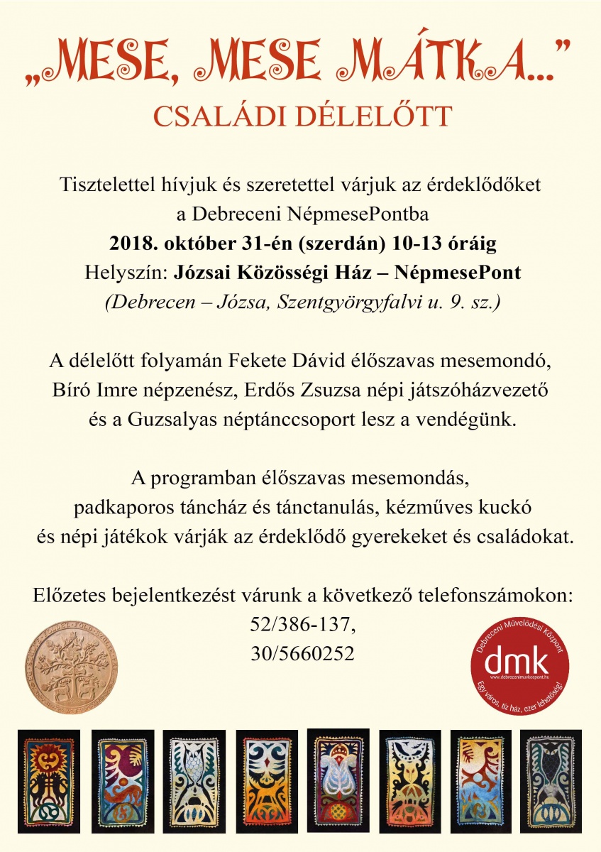 A Debreceni NépmesePont tisztelettel hívja és szeretettel várja az érdeklődőket 2018. október 31-én (szerdán) 10-13 óráig a Józsai Közösségi Ház–NépmesePontban. (Debrecen–Józsa, Szentgyörgyfalvi u. 9. sz.)