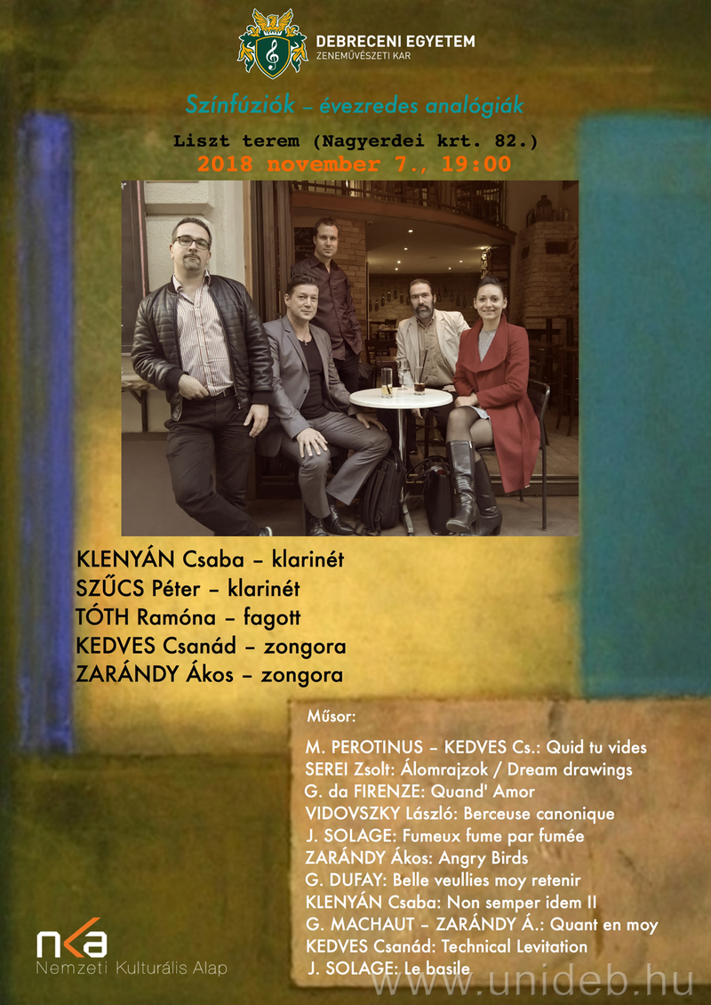 November 7-én 19 órától Színfúziók – évezredes analógiák címmel Klenyán Csaba – klarinét, Szűcs Péter – klarinét, Tóth Ramóna- fagott, Kedves Csanád és Zarándy Ákos – zongora hangversenyére kerül sor a Debreceni Egyetem Zeneművészeti Kar Liszt termében.