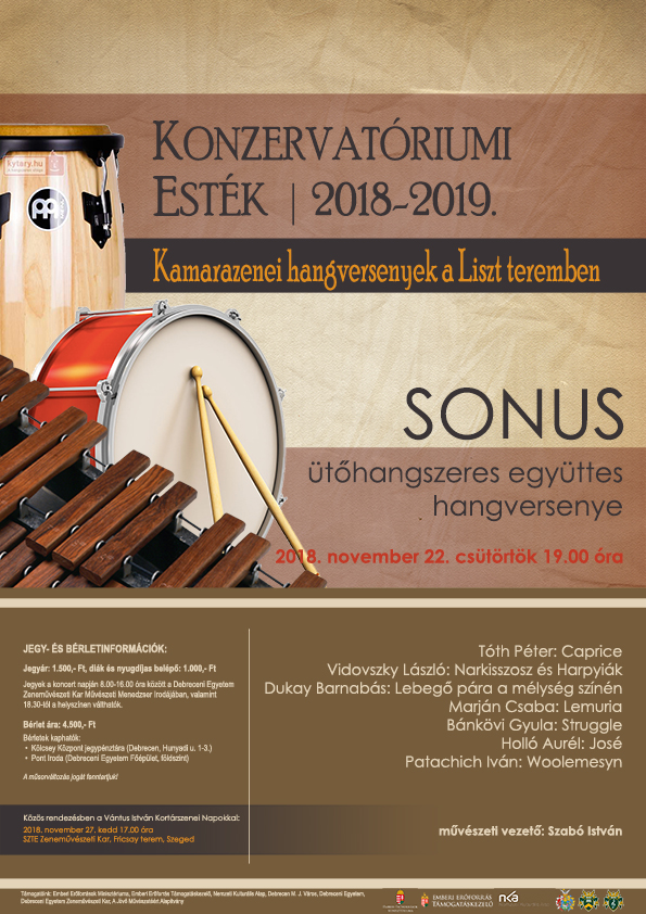 November 22-én, csütörtökön 19.00 órakor a SONUS ütőhangszeres együttes különleges hangversenyével indul a Konzervatóriumi Esték hangversenysorozat.