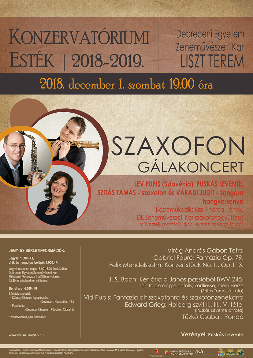 December 1-jén, szombaton 19.00 órakor a Debreceni Egyetem Zeneművészeti Kar Liszt termében a Konzervatóriumi Esték hangversenysorozat vendége Szlovénia egyik kimagasló  klasszikus szaxofonművésze, Lev Pupis lesz. A Ljubljanai Zeneakadémia professzora  rendkívül sokszínű és sokoldalú előadóművész. Szólistája és egyben alapító tagja a „4SAXESS” kvartettnek, mellyel bejárta egész Európát és az Egyesült Államokat,