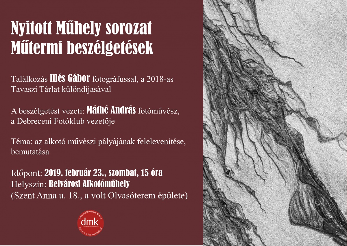 Az idei első Nyitott Műhely Sorozat Műtermi Beszélgetések vendége február 23-án 15.00 órától Illés Gábor fotográfus, a 2018-as Tavaszi Tárlat különdíjasa lesz. Az alkotóval Máthé András fotóművész, a Debreceni Fotóklub vezetője beszélget. A kötetlen hangulatú délutánon az alkotó művészi pályájának felelevenítésére, bemutatására törekednek majd.