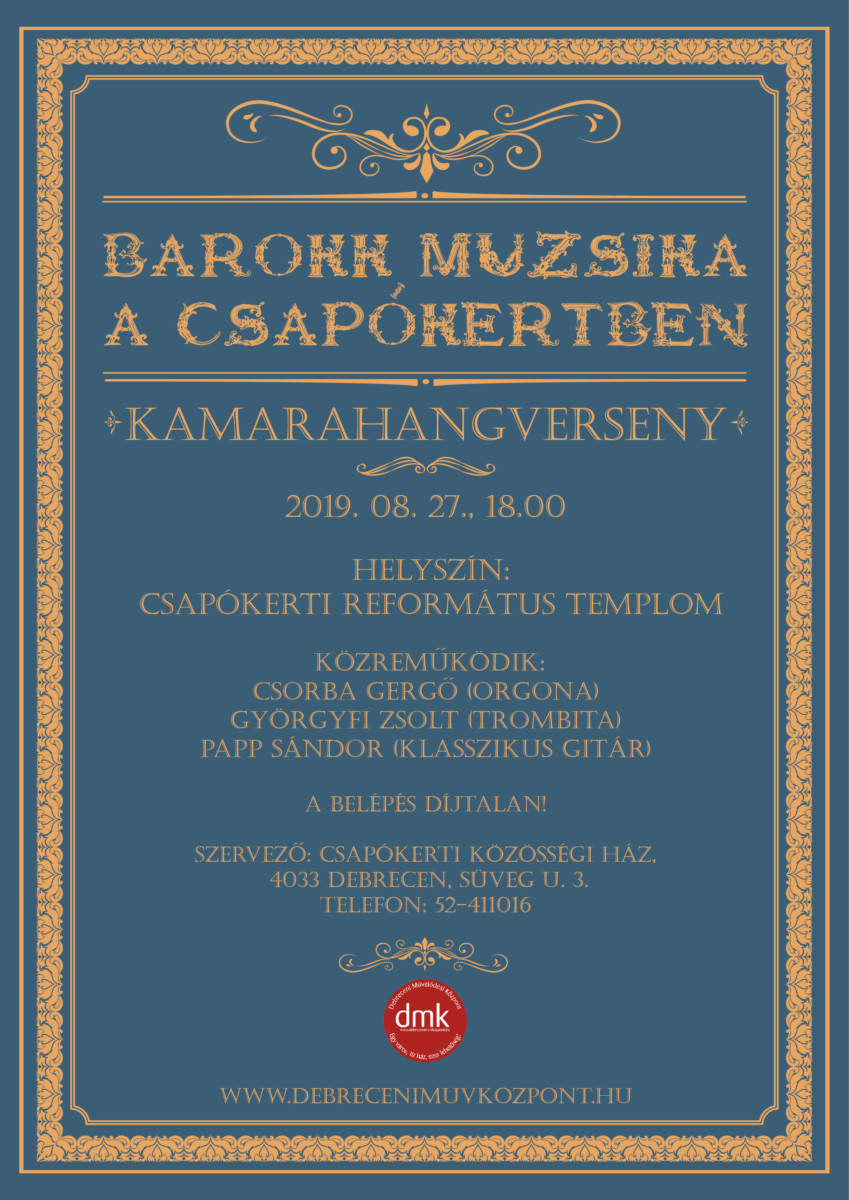 Augusztus 27-én, 18.00 órakor “Barokk muzsika a Csapókertben” – című kamarahangversenyre invitálják a komolyzenét kedvelő vendégeket Csorba Gergő (orgona), Györgyfi Zsolt (trombita) és Papp Sándor (klasszikus gitár) közreműködésével. A Csapókerti Református Templomban zajló kamarahangversenyre a belépés díjtalan.