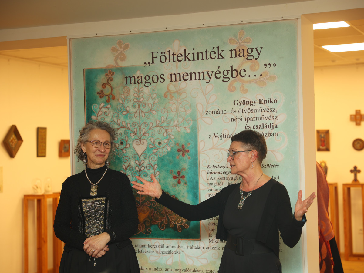 Gyöngy Enikő népi iparművész csaknem négy évtizedes alkotómunkásságát mutatja be a „Föltekinték nagy magos mennyégbe…” című tárlat a Vojtina Bábszínház Kálvin téri kiállítótermében.