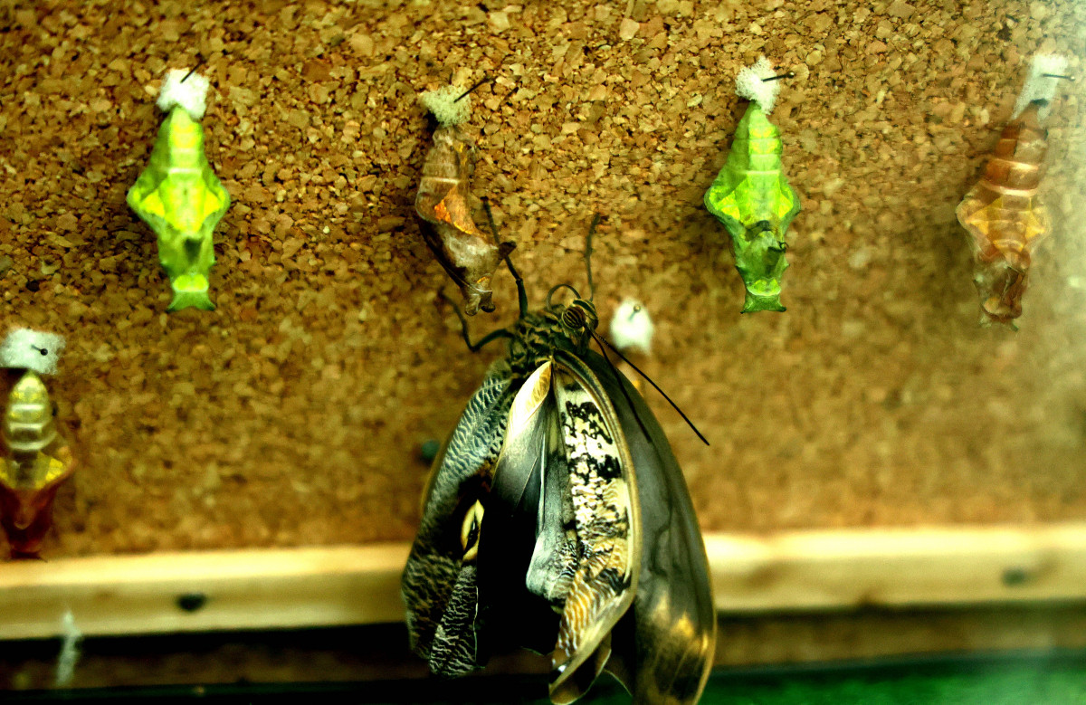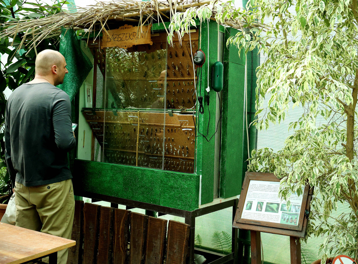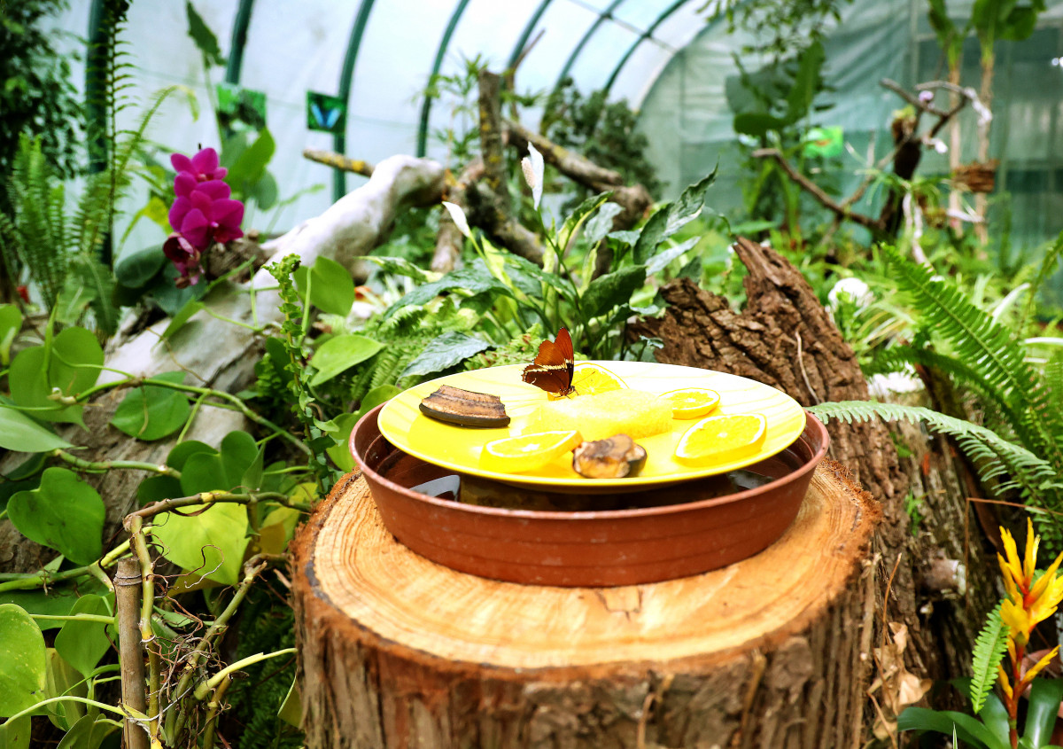 A füvészkert munkatársai csöppnyi esőerdőt varázsoltak az egyik fóliasátor alá, ahol a bábszekrényben lévő bábokból – melyek havonta érkeznek Costa Ricából – folyamatosan bújnak elő a pillangók és szemet gyönyörködtetően libbennek növényről-növényre, a lepkeetetőknél lakmároznak vagy éppen a látogatók karján, ruháján landolnak.