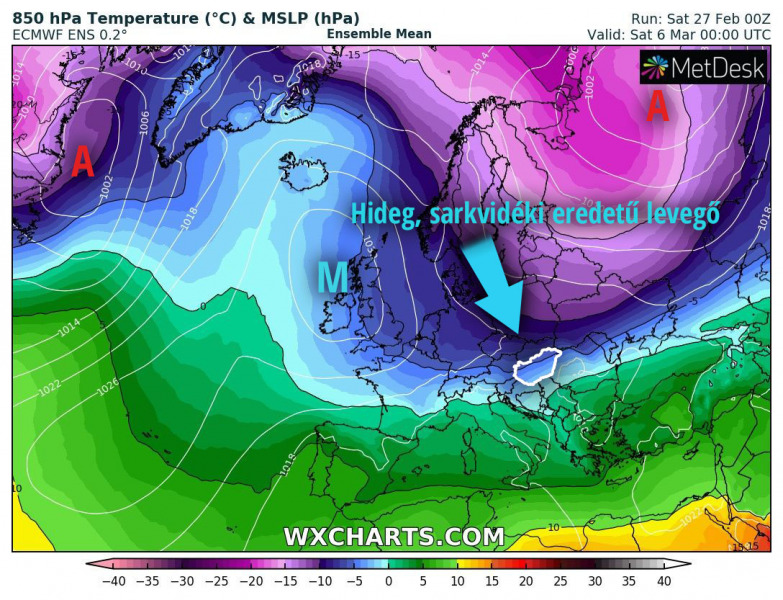 A változást hozó hidegfront péntekre virradóan érkezhet meg észak-északnyugat felől, mögötte több hullámban hideg, sarkvidéki eredetű levegő áraszthatja el térségünket. Így jövő hét végén éjjelente erősebb fagyok is lehetnek, és a jelenlegi számítások szerint napközben sem lesz melegebb 2-7 foknál.
