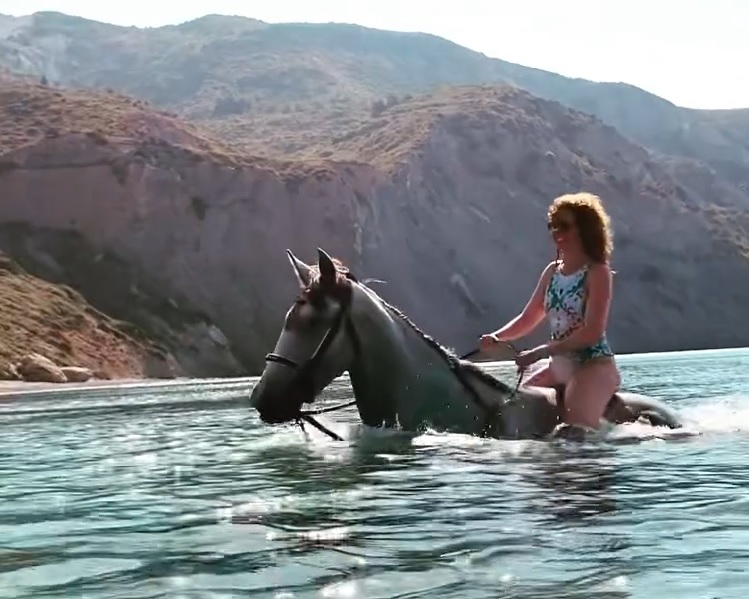 Nem tudni, miért, de ezt a fürdőruhás, lovaglós videót osztotta meg magáról, amint a tengerből jön ki négylábú barátjával.