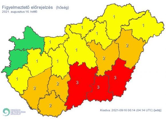 Szintén a hőség miatt Baranya, Hajdú-Bihar, Jász-Nagykun-Szolnok, Somogy és Tolna megyére másodfokú, Budapestre, Pest, Borsod-Abaúj-Zemplén, Fejér, Heves, Komárom-Esztergom, Nógrád, Szabolcs-Szatmár-Bereg, Veszprém és Zala megyére elsőfokú figyelmeztetést adtak ki.