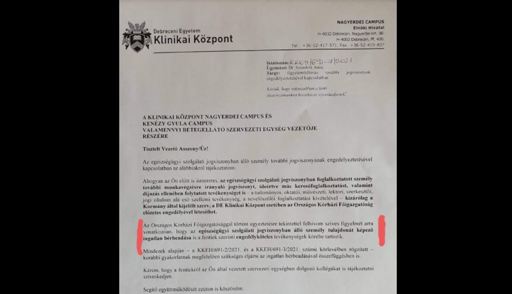 A Debreceni Egyetem klinikai központjának részlegvezetőit levélben figyelmeztették arra, hogy az új jogviszonyban dolgozóknak más keresőfoglalkozásaikat, díjazásért végzett tevékenységeiket csak az Országos Kórházi Főigazgatóságtól (OKFŐ) előzetes engedélyével végezhetik.
