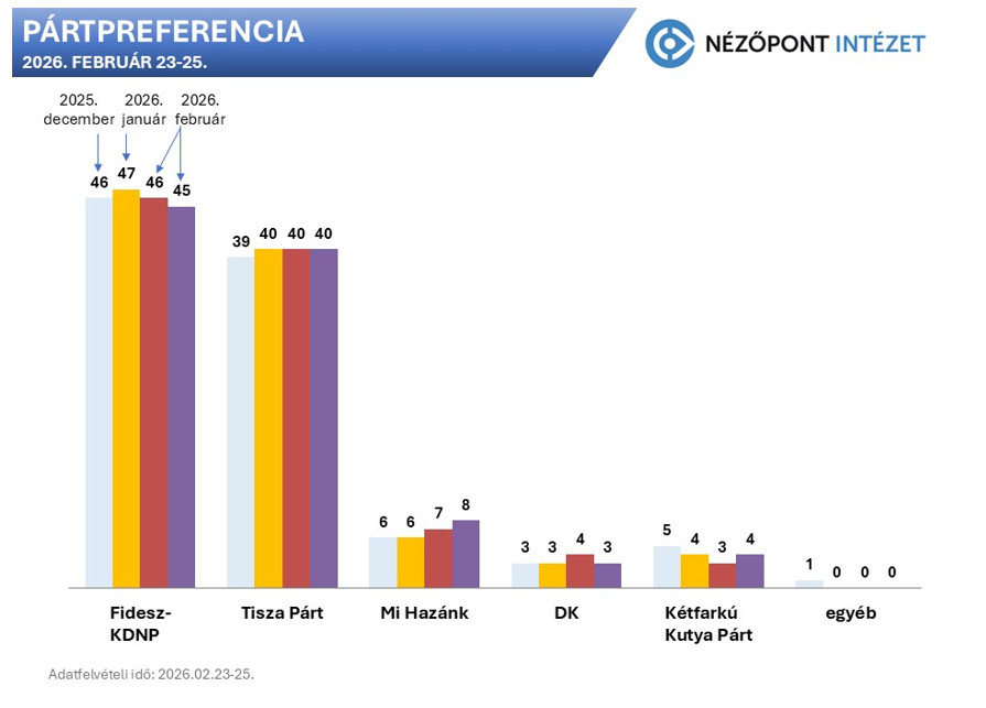 A február 23. és 25. között, 1000 fő telefonos megkérdezésével készült kutatás alapján egy most vasárnapi választáson a legvalószínűbb listás eredmény – amely az összes részvételét biztosra mondó válaszadó pártpreferenciáját figyelembe veszi – 45 százalékot kapna a Fidesz-KDNP listája, a Tisza Párté pedig 40-et.