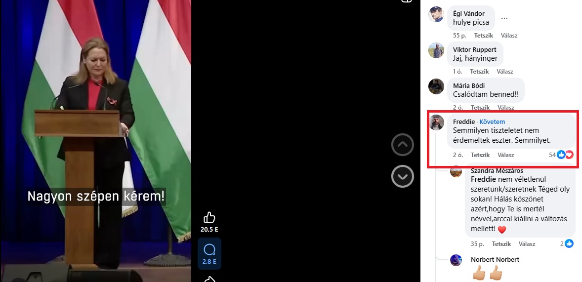 A megjegyzés egy olyan, február 12-én közzétett videó alatt jelent meg, amelyben Vitályos Eszter kormányszóvivő egy élőben közvetített kormányinfón “több tiszteletet kért” egy újságírótól Gulyás Gergely, a Miniszterelnökséget vezető miniszter felé. Az újságíró azt vetette fel, hogy a miniszter a gödi Samsung-gyárral kapcsolatos kérdésekre nem válaszolt.