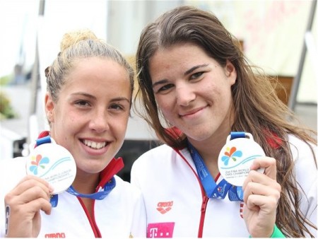 Kiss Nikoletta arany-, a debreceni Sibalin Flóra pedig bronzérmet szerzett a balatonfüredi junior nyíltvízi úszó-világbajnokságon, a junior lányok szombati 7,5 kilométeres versenyében, amelyet Orbán Viktor miniszterelnök indított el.