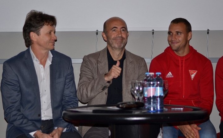 Résztvevői: dr. Róka Géza a DVSC cégvezetője, Leonel Pontes vezetőedző, Tőzsér Dániel az új csapatkapitány és a DVSC újonnan igazolt játékosai.