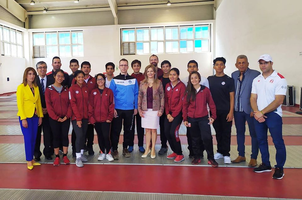 A képen: Dr Szőke Csaba(kékben), Tóth Katalin nemzetközi kapcsolatokért felelős helyettes államtitkár, Görömbölyi Dávid perui konzul és a perui vívóválogatott társaságában