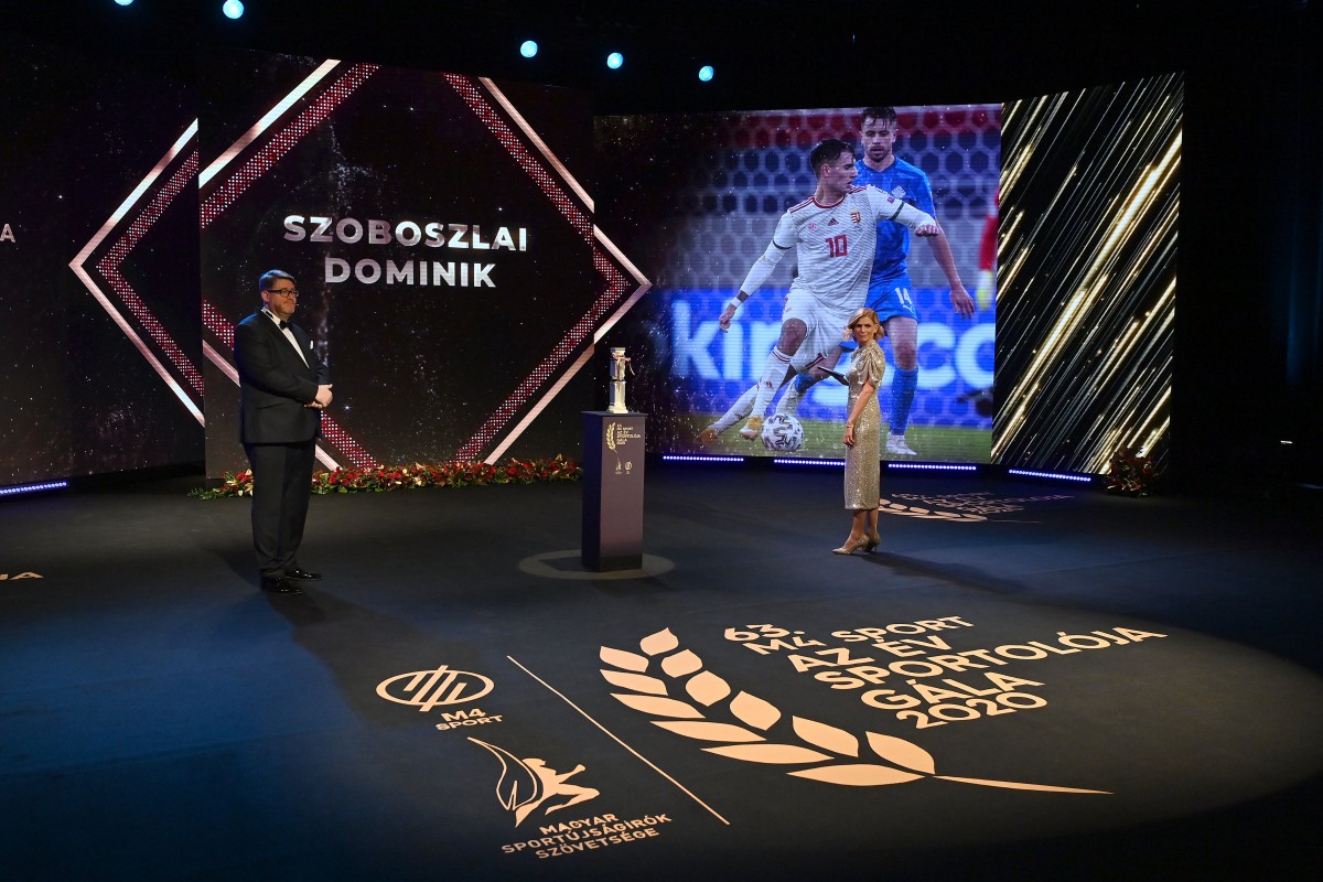 A Magyar Sportújságírók Szövetsége (MSÚSZ) 63. alkalommal választotta meg az Év sportolóit, a mostani szavazáson 412 sportújságíró adta le voksát.Szoboszlai Dominik válogatott labdarúgónak, az év sportolójának képe a kivetítőn az M4 Sport – Az Év sportolója gála televíziós felvételén a Nemzeti Színházban 2021. január 8-án. A színpadon Szöllősi György, a Magyar Sportújságírók Szövetségének elnöke és Berkesi Judit, a gála háziasszonya. A 63. alkalommal megrendezett díjátadóra a koronavírus-járvány miatt nézők nélkül került sor. MTI/Illyés Tibor