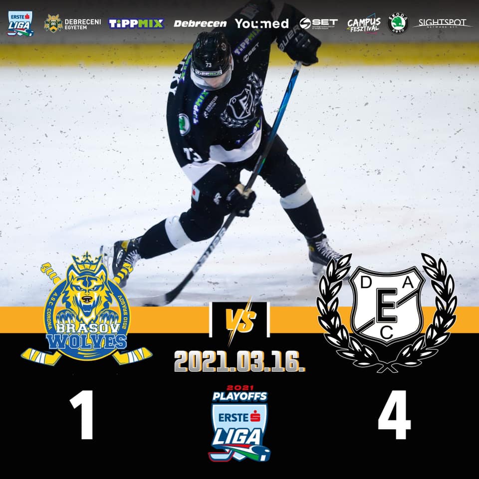 A vendég DEAC a 41 lövést védő Hetényi Zoltánnak köszönhetően 4-1-re nyert az alapszakaszgyőztes Brassó otthonában a jégkorong Erste Liga elődöntő első mérkőzésén.