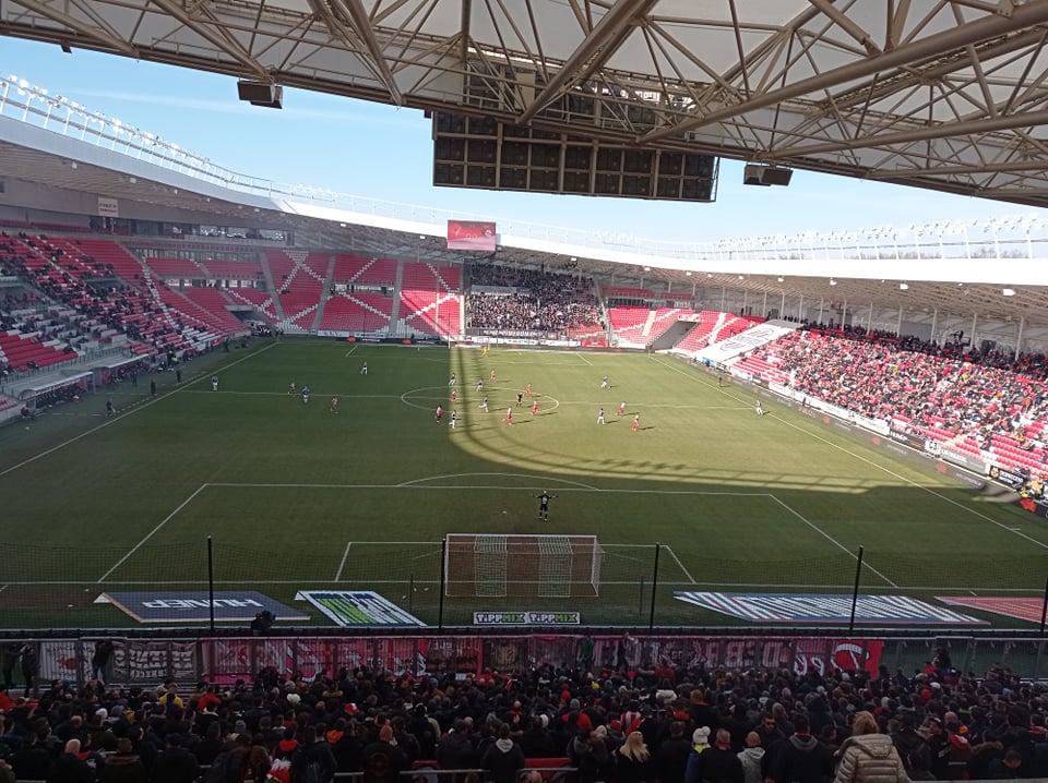 Hömpölygött az embertömeg a stadion felé, így aztán a motozást letudva kezdés után 2 perccel már bent is voltunk. Miután a „szokásos” helyünk foglalt volt, így magaslati levegőt szívva néztük végig ezt a nagyon hangulatos összecsapást a tribün legtetején, ahonnan csodálatos volt a kilátás a pályára.