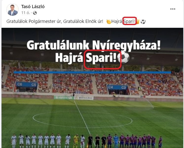Na, de a lényeg: Tasó úr konzekvensen “Spari” névvel illette a nyíregyházi klubot, a Szparit. Mi lesz a következő? A Loky?