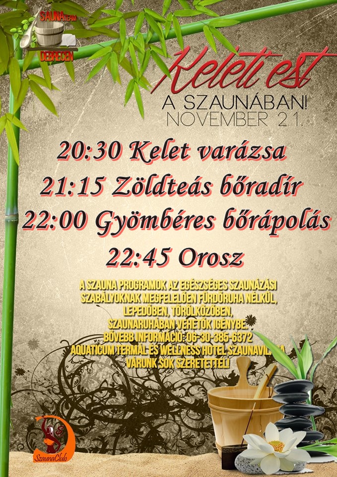 Péntek este a mesés keletre utazhatunk a Sauna Team Debrecen szaunamestereivel. Keleti illatokkal, zenékkel, frissítő zöld teás bőrradírral, gyömbéres bőrápolással várjuk a hozzánk érkezőket.