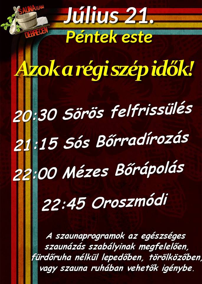 Lassan eltelik egy újabb hét. Odakint 40 fok, a szaunában 90. Mindenki a Campuson, így aki nem szeret tömegben szaunázni, most van itt a lehetőség kicsit kikapcsolódni. Timi és Sanyi kezdik az estét, egy sörös felfrissüléssel, és egy igazán jó sós bőrradírral. Majd Peti és Tamás folytatja egy mézes bőrápolással, és egy pokolian forró orosz programmal.